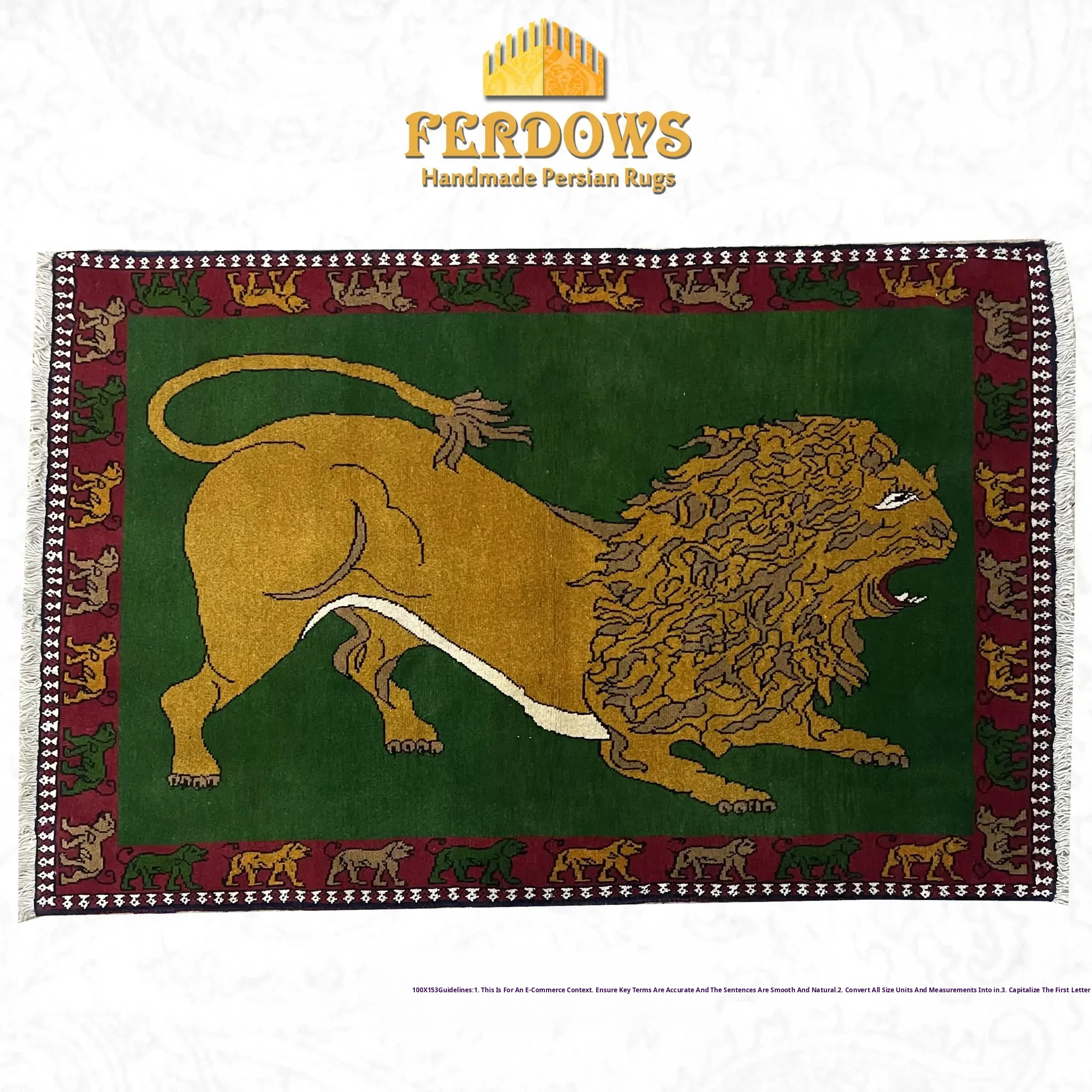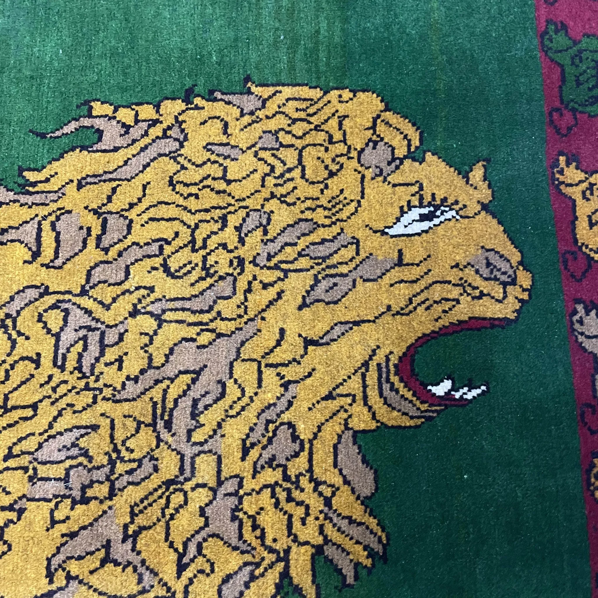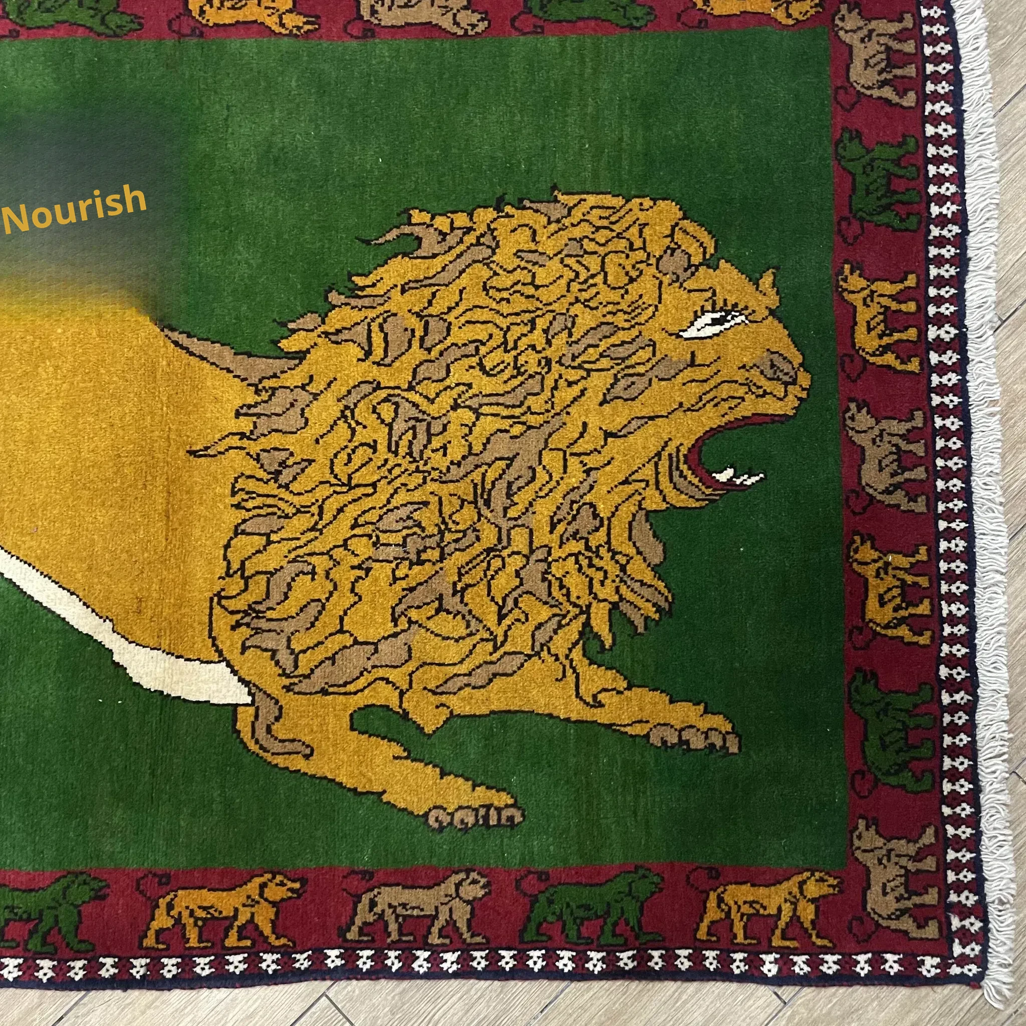 FERDOWS Handcrafted Green Wool Carpet - Exquisite Lion Design for Rustic and Bohemian Decor, Imported Quality Artisan Weaving