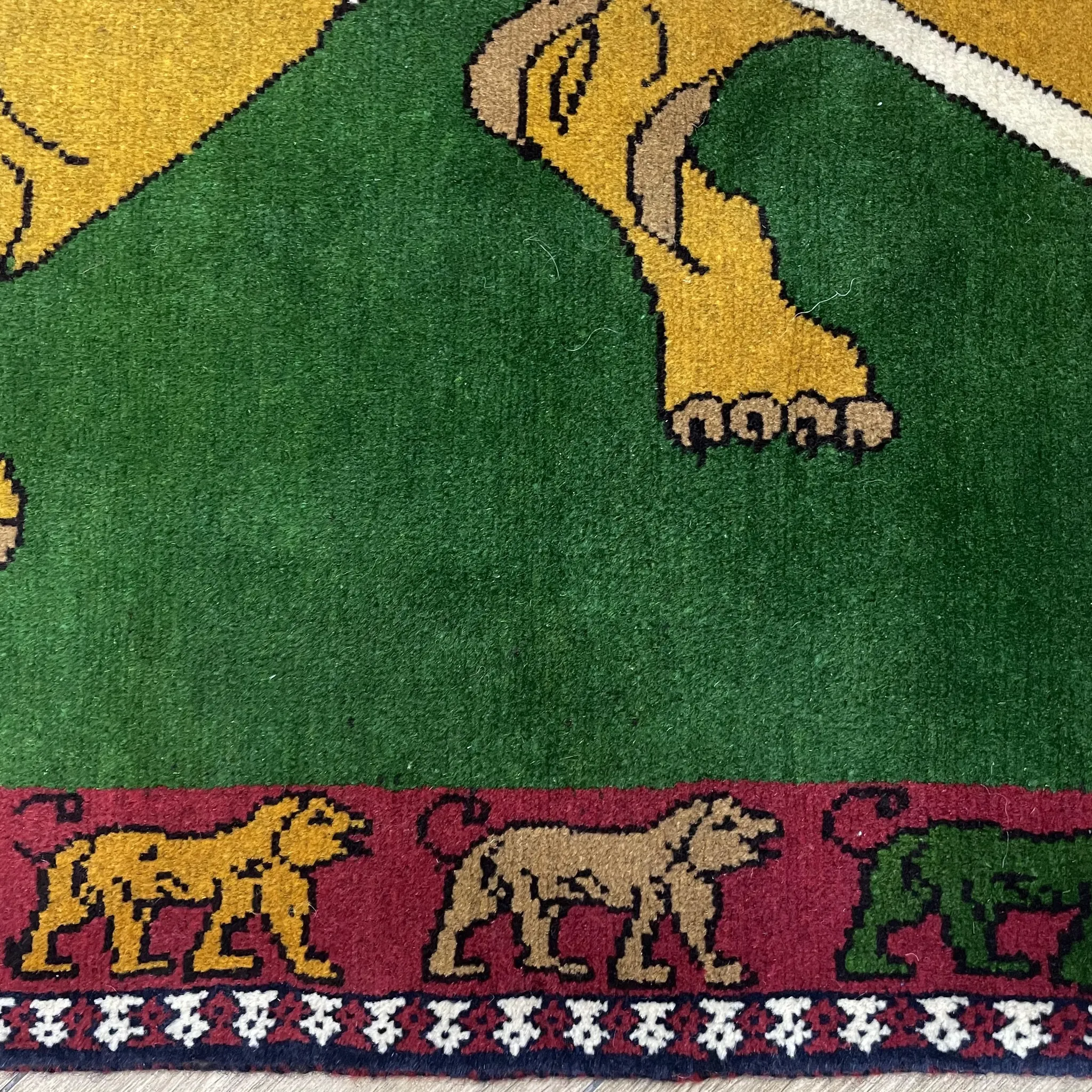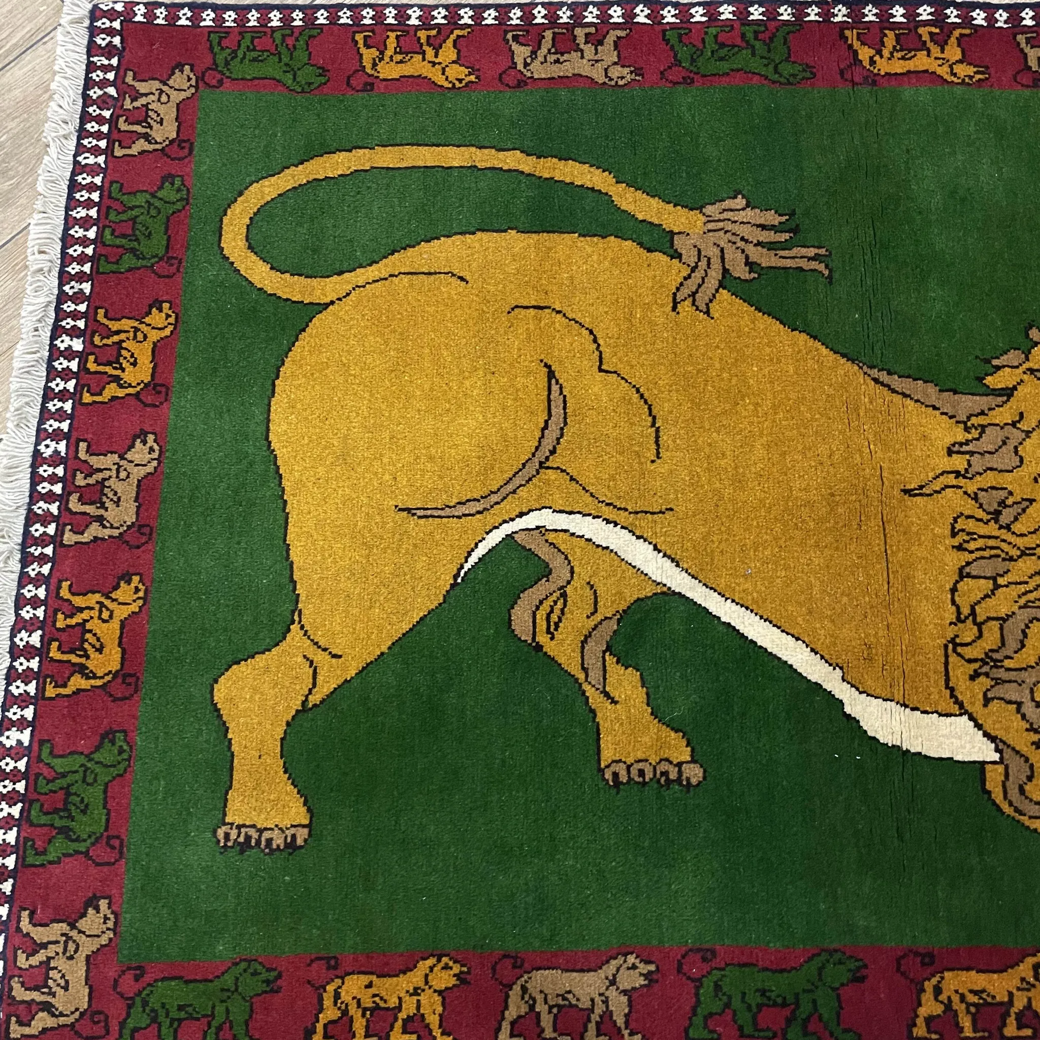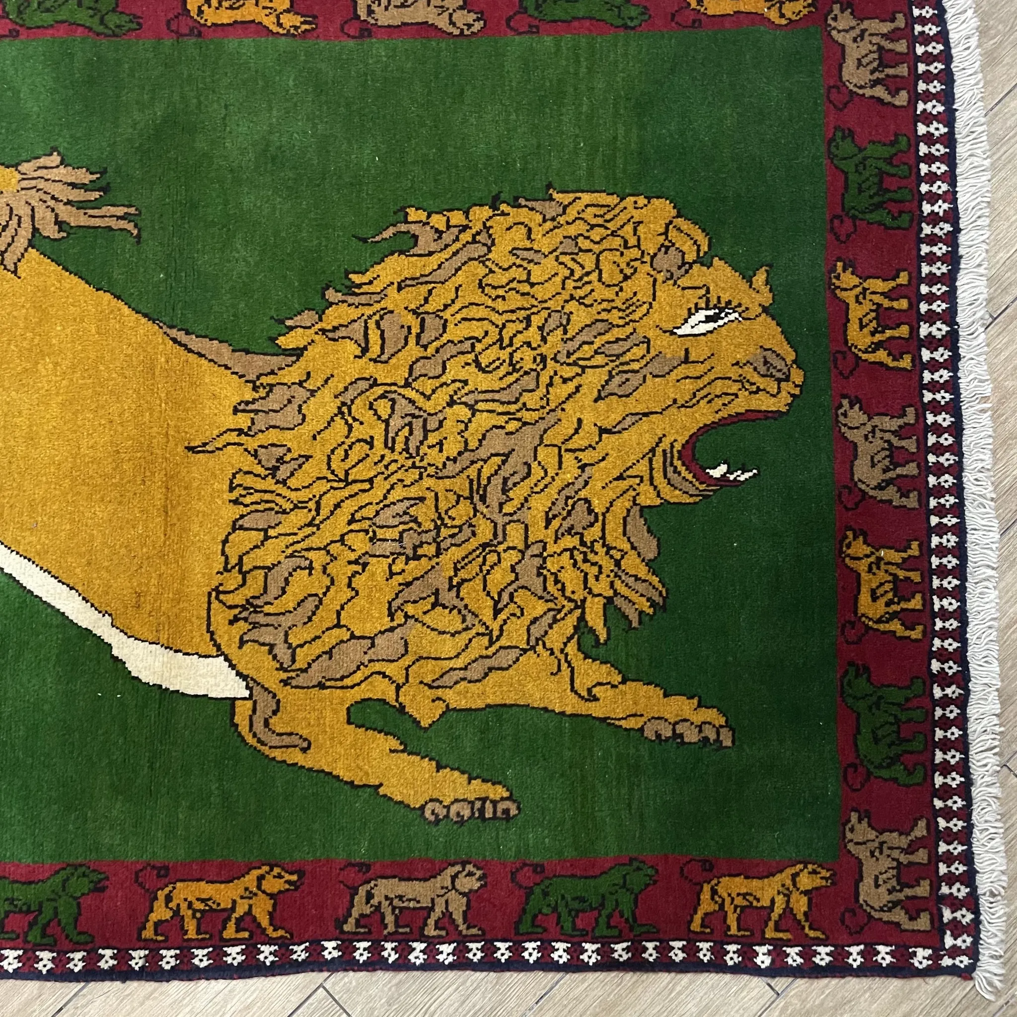 FERDOWS Handcrafted Green Wool Carpet - Exquisite Lion Design for Rustic and Bohemian Decor, Imported Quality Artisan Weaving