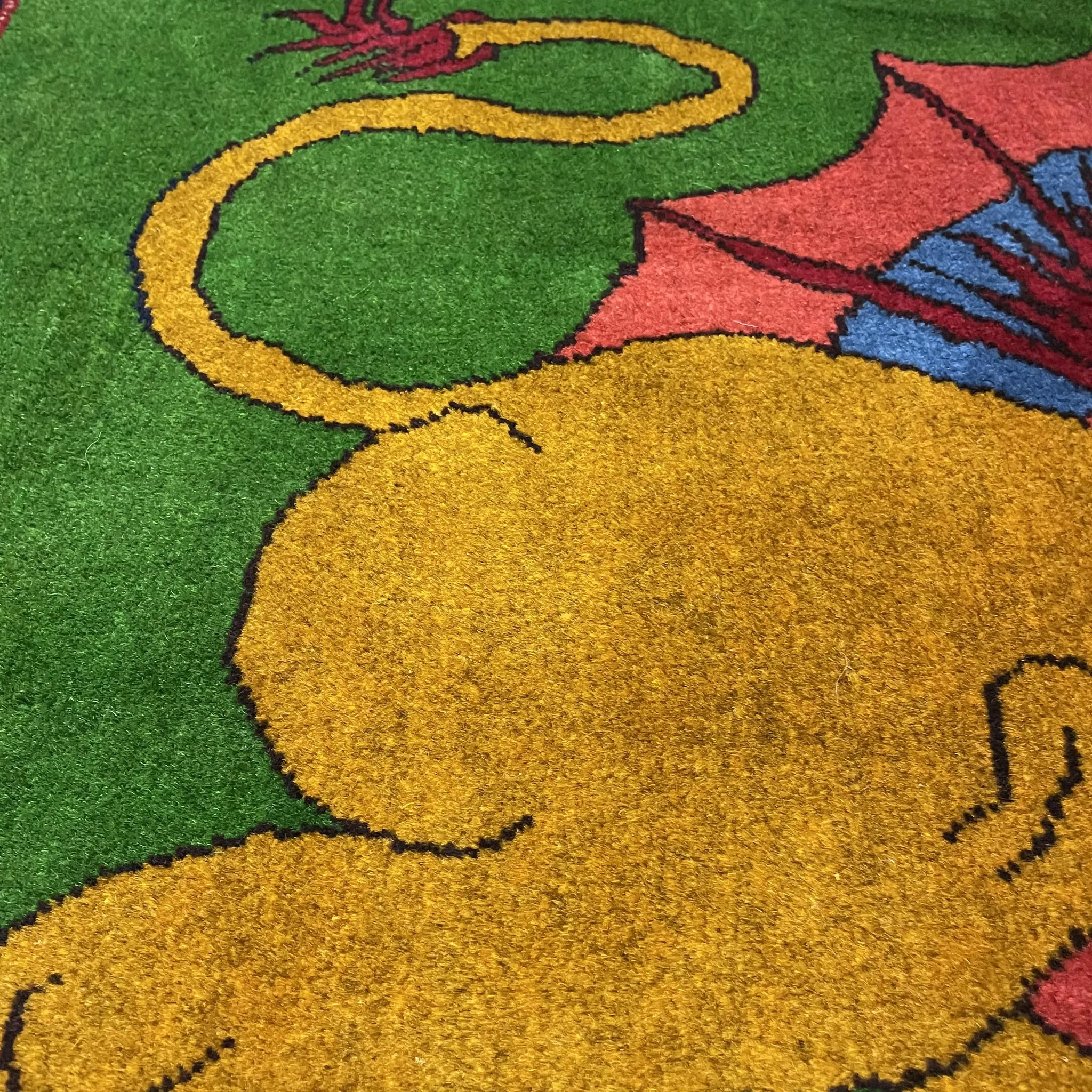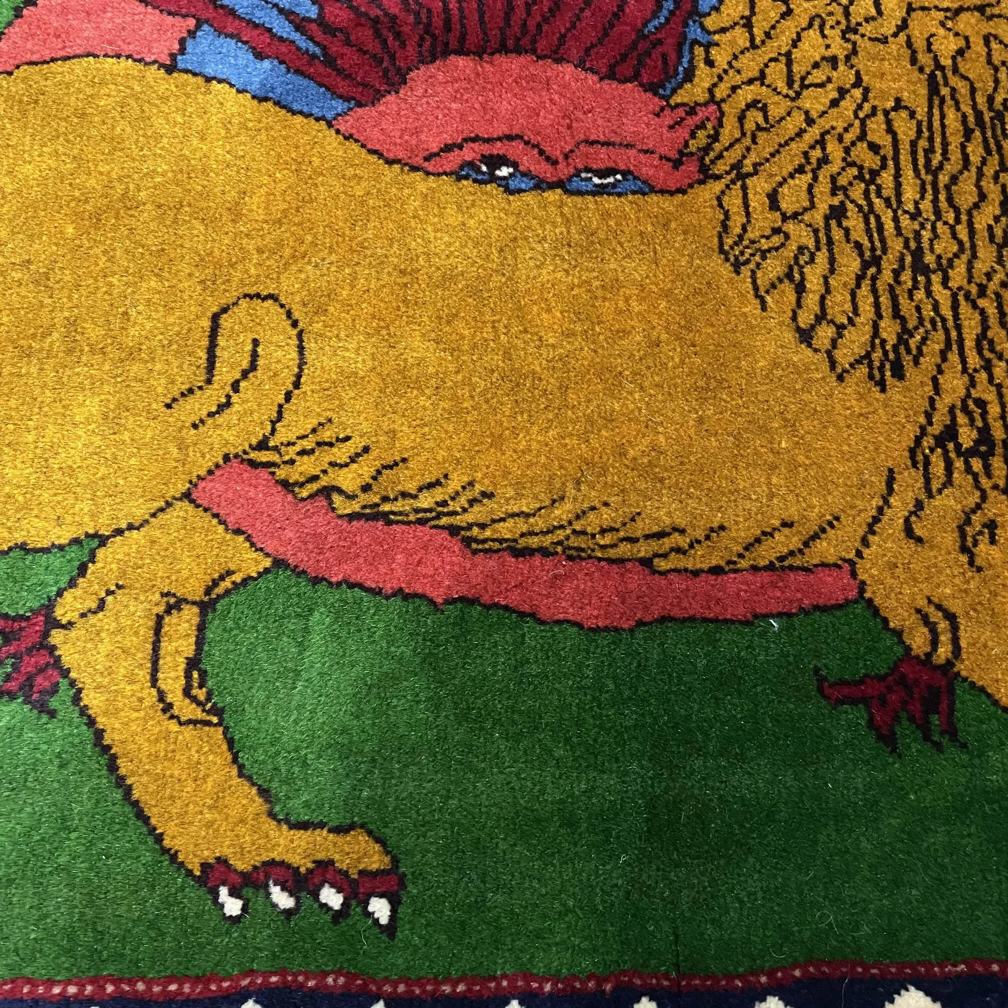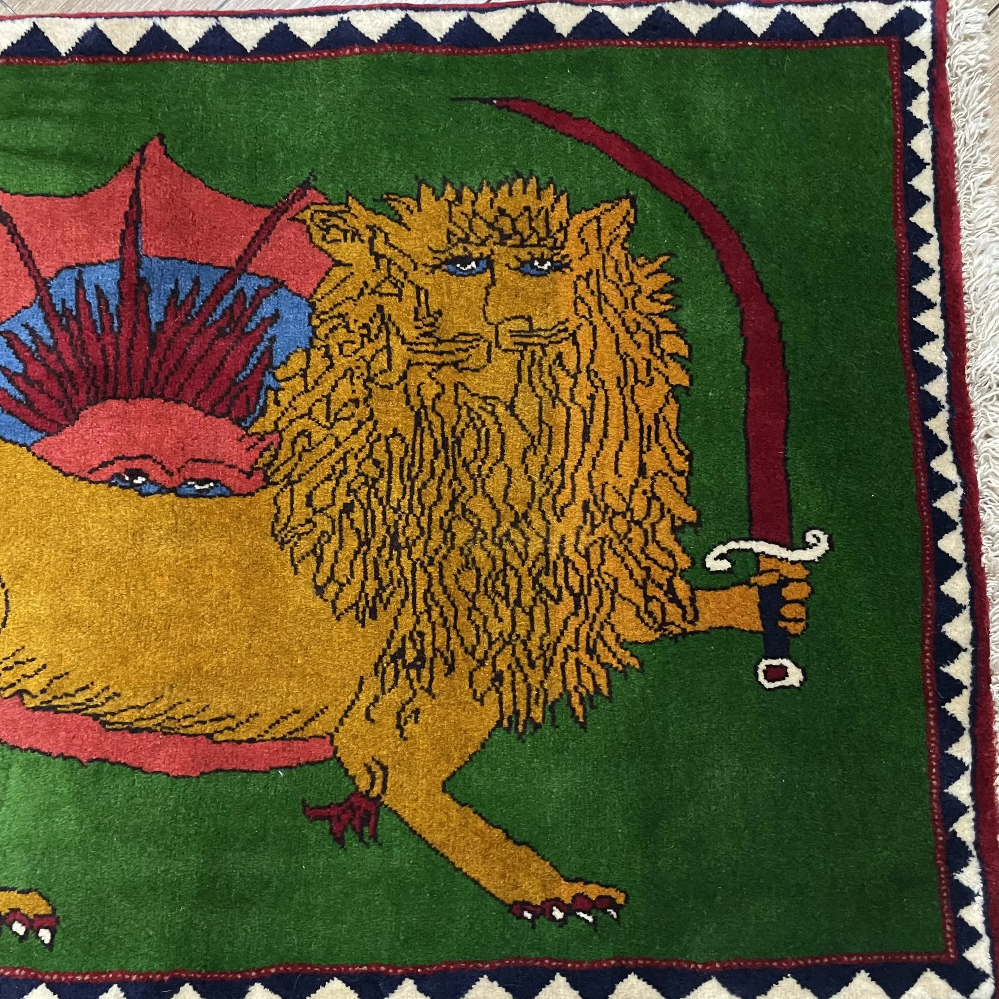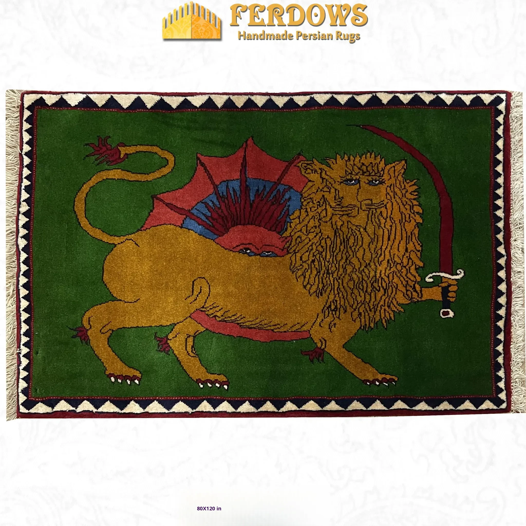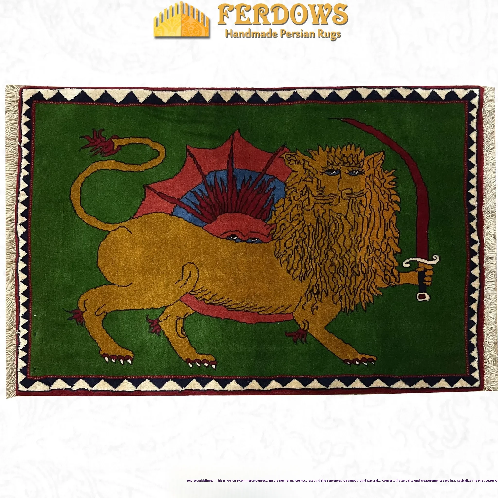 FERDOWS Handcrafted Persian Carpet / Tapestry - Pure Wool Green Lion Design, Ethnic Nomadic Style, Artfully Knotted for Unique Home Decor