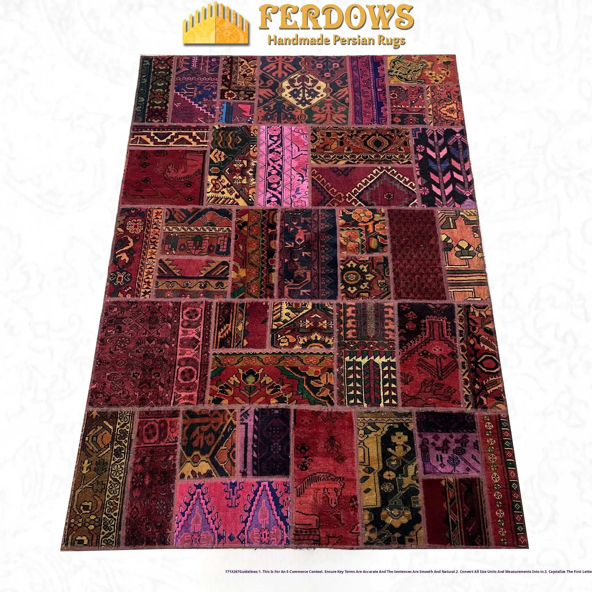 FERDOWS Vintage Persian Patchwork Carpet - Handcrafted Imported Pure Wool, Distressed Bohemian Design for a Touch of Exotic Elegance