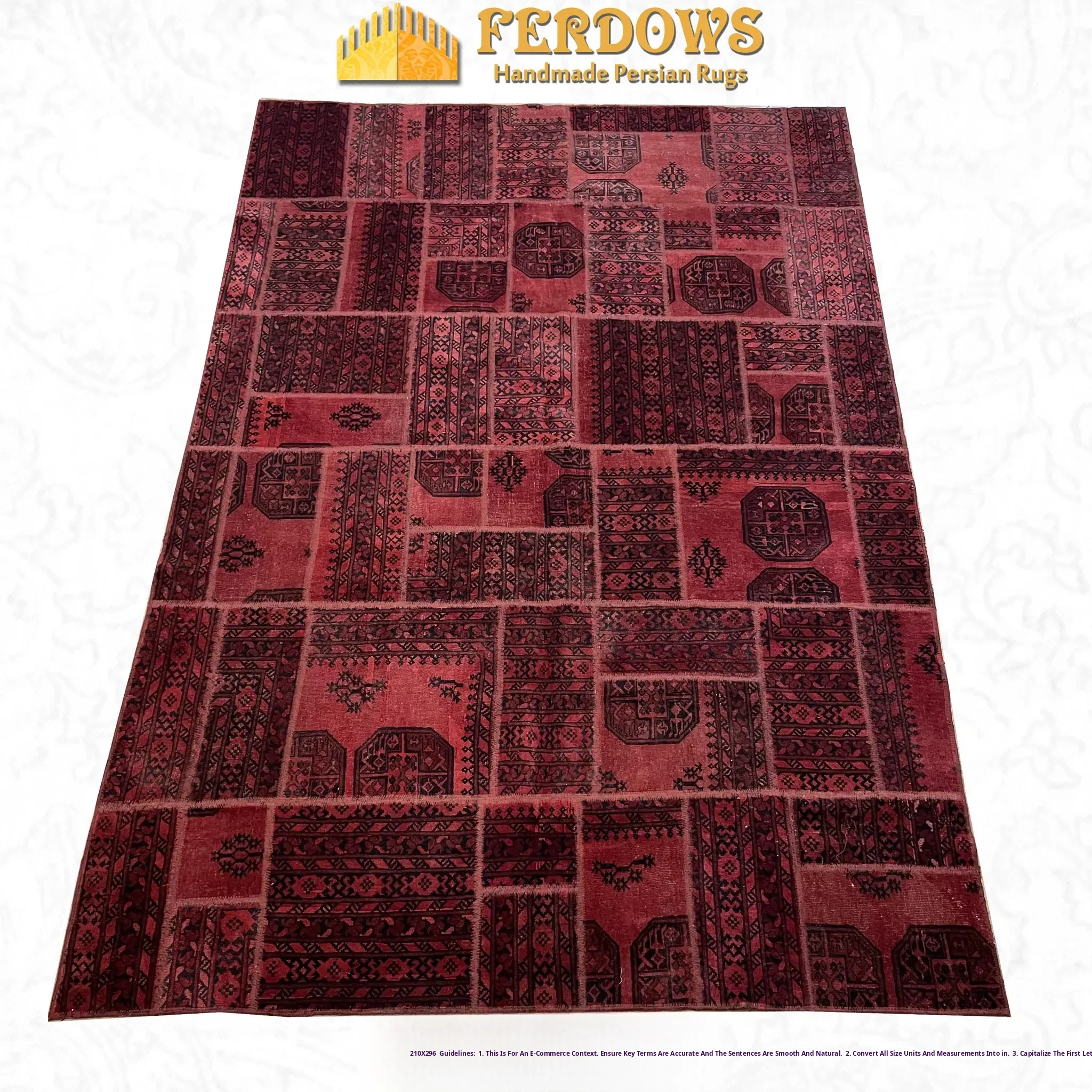FERDOWS Vintage Persian-Inspired Handwoven Patchwork Carpet - Imported Pure Wool in Rich Red, Exuding Timeless Charm and Exotic Elegance