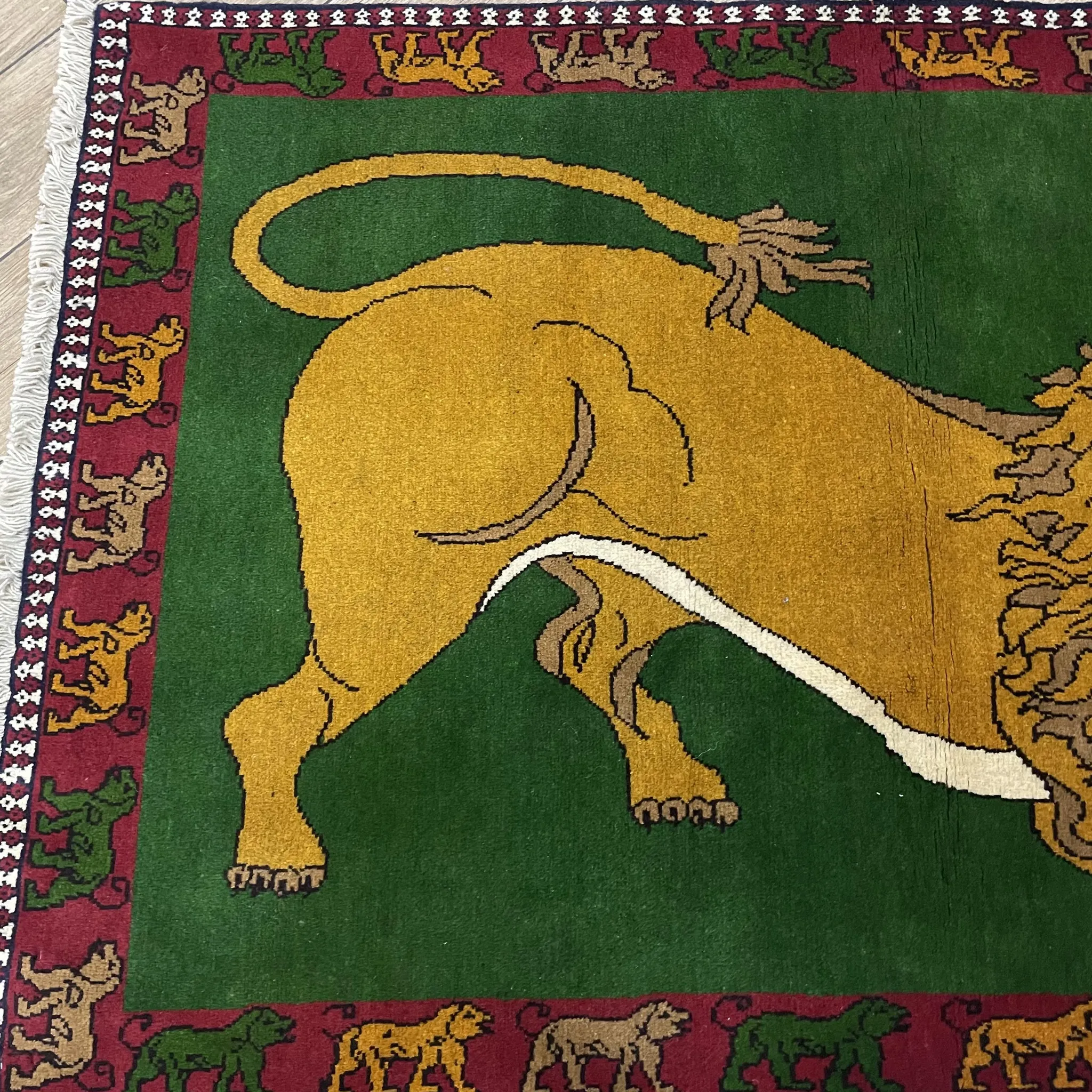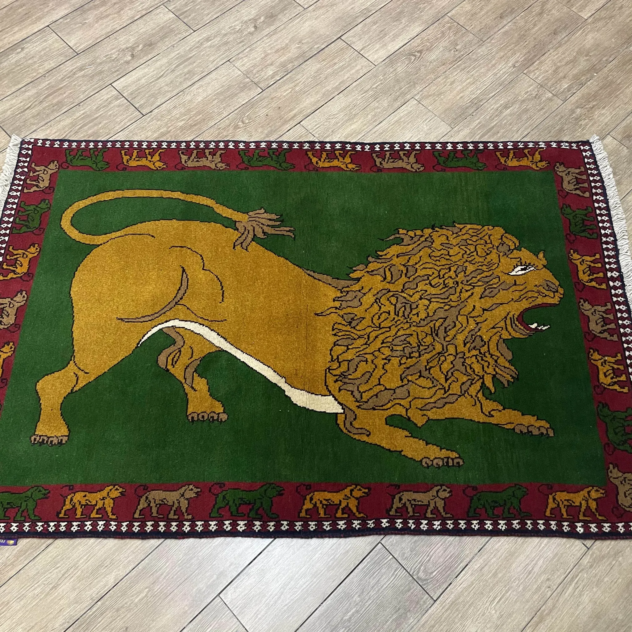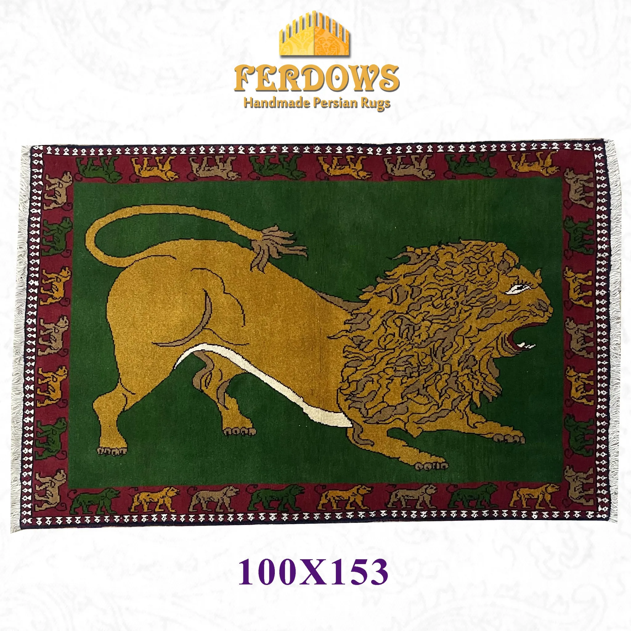 FERDOWS輸入品 手作りの結び目で織られた純羊毛カーペット - 美しい緑色の動物ライオンデザイン、田舎風の牧歌的な魅力をお届けします!