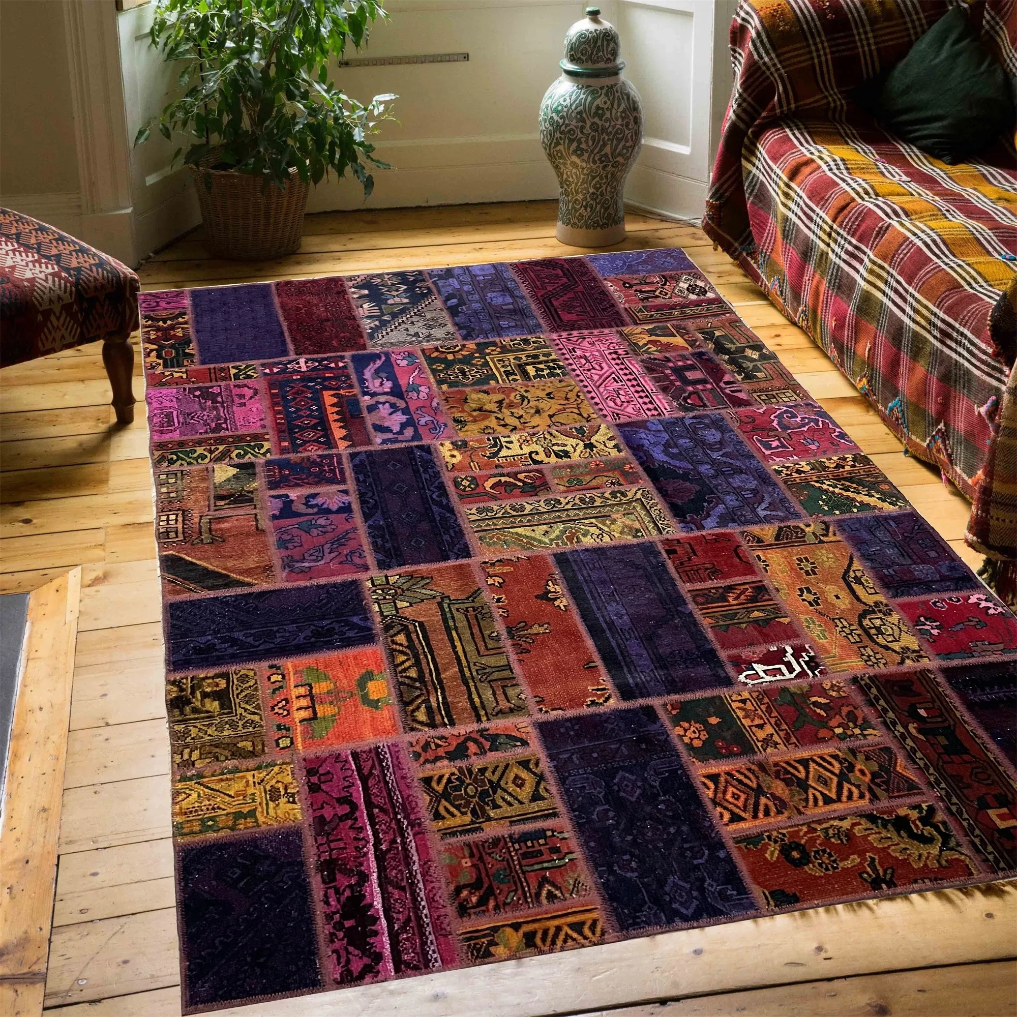 FERDOWSパッチワークラグ - 本格輸入の手織り純ウール、カラフルなペルシャ風エスニックモロッコスタイル!あなたの空間を華やかに彩る一品。